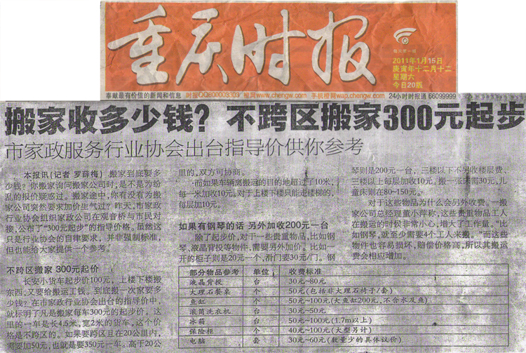 2011年家政協(xié)會搬家指導(dǎo)價格